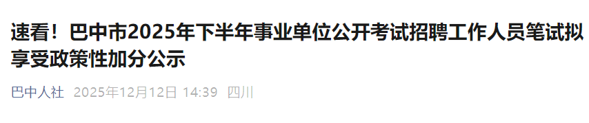 根据《四川省巴中市2025年下半年事业单位公开考试招聘工作人员公告》和国、省关于事业单位公开招聘政策性加分的规定,经考生申请、招考单位同级人力资源社会保障局审核,现就巴中市2025年下半年事业单位公开考试招聘工作人员笔试拟享受政策性加分情况予以公示。公示期限为2025年12月12日至2025年12月16日。公示期间,如对加分情况有异议的,请实名书面向报考单位的同级人力资源社会保障局反映,并提供必要证据和调查线索,匿名或逾期反映的不予受理。