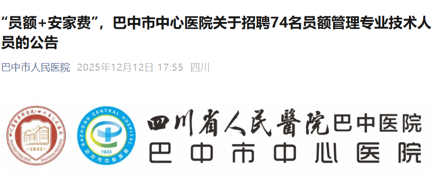 为进一步做好人才储备工作,强化人才队伍建设,根据《巴中市市级公立医院员额管理实施办法(试行)》相关要求,结合工作需要,现面向社会招聘74名员额管理专业技术人员。