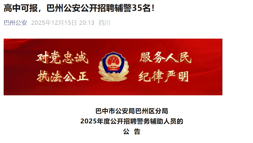 本次计划招聘35名辅警,招聘岗位、名额及资格条件等详见《巴中市公安局巴州区分局2025年公开招聘警务辅助人员职位设置表》(限退役士兵)。