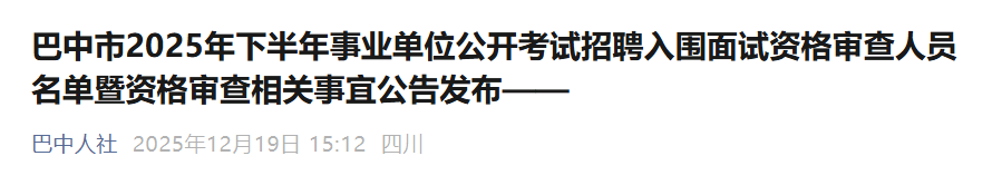 根据《四川省巴中市2025年下半年事业单位公开考试招聘工作人员公告》(以下简称《招聘公告》)规定,现将入围面试资格审查人员名单和资格审查相关事宜予以公告。